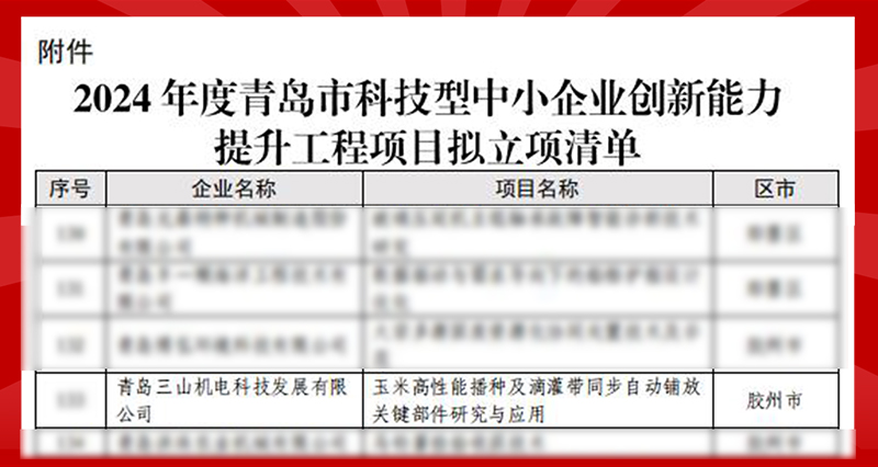 近日,青岛三山机电科技发展有限公司再传喜讯,公司和山东理工大学合作的项目——玉米高性能播种机滴灌带同步自动辅放关键部件研究与应用项目,成功斩获青岛市和山东省科技型中小企业创新能力提升工程计划拟立项项目两级通过。